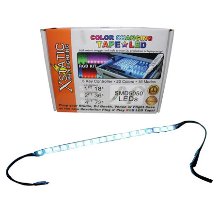 Add instant swagger and style to your DJ, production, or laptop setup with the Xstatic LED Strip RGB KIT. 12 inches of SMD LEDs on a tough, durable 3M tape strip, is the new lighting solution from Xstatic and is a surefire way to illuminate everything from Flight Cases to kitchen counters. Did we mention the RGB color-changing capabilities of the LED strip, complete with strobe and color changing effects? This is a revolutionary new tool for venues, studios, retail stores and the home that is lightweight, flexible, and easy to install: just plug in the strip and watch Xstatic transform your lighting decor! This LED tape strip is a revolutionary lighting accent tool for anyone to use. Essential for any lighting needs in spaces with size limitations.