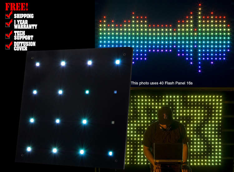 The Flash Panel 16 is an affordable LED panel that can be controlled via DMX or via the optional CF card controller (Model: FP CFC). Multiple panels can be linked together to make one large screen. Dynamic effects can then be played on it, which makes this system ideal for DJ’s and night clubs. Each panel has 16 RGB pixels, each of which can be individually controlled via any universal DMX512 controller. The panel also features 3 pin XLR, DMX input / output connectors and standard IEC connectors to link panels to each other. There are also stand dip switches on the rear of the panel for DMX addressing and stand alone operation.