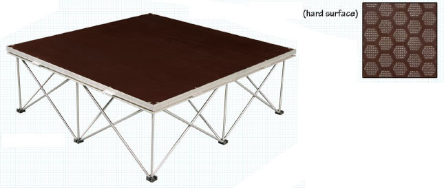 Our Duro Deck staging is easy to set up and store. Decks come in 48" X 48" pieces and can be set up at any of the available four heights of collapsible risers: 8", 16", 24" or 32".